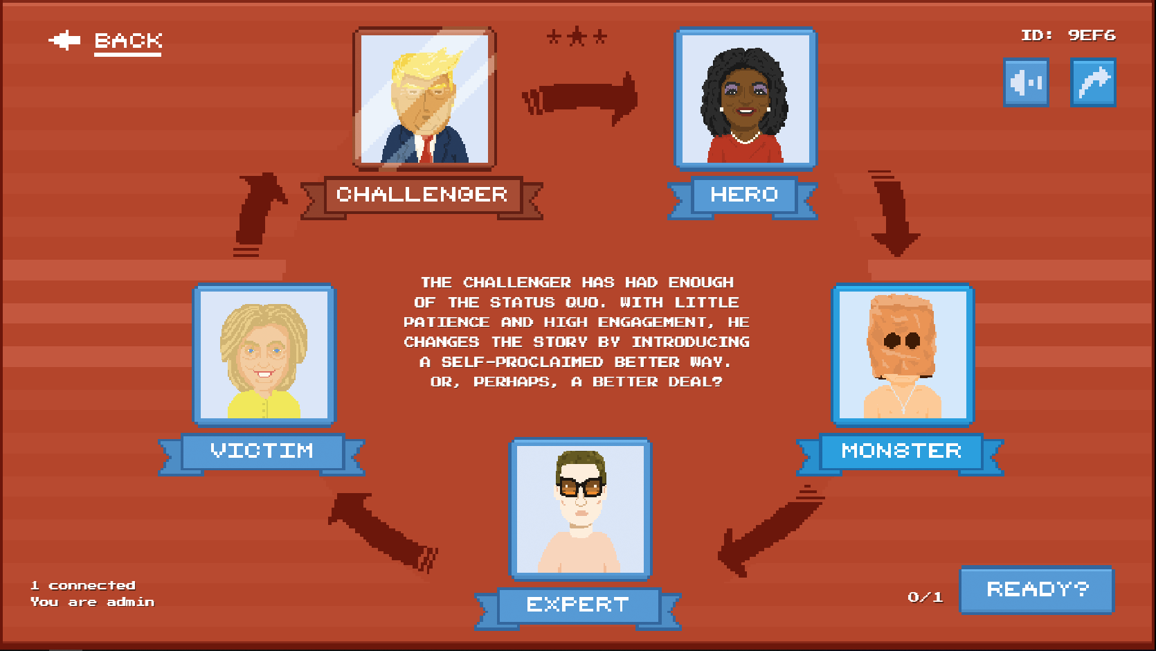 “Who Wants To Be A President” is a satirical game based on Geelmuyden Kiese’s “Role graph”. You have to choose between which role you want to play in the election. Are you the “Expert” or the “Victim”, or maybe even the “Challenger”? Each role is explained in the character selection screen and ties back to the story. Your goal in the game is to be the sole survivor and be crowned the next “President”.
